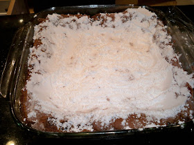 - Divide dough in half and press half into a greased brownie pan (appx 9X9). Bake 10 minutes, then remove and set aside.